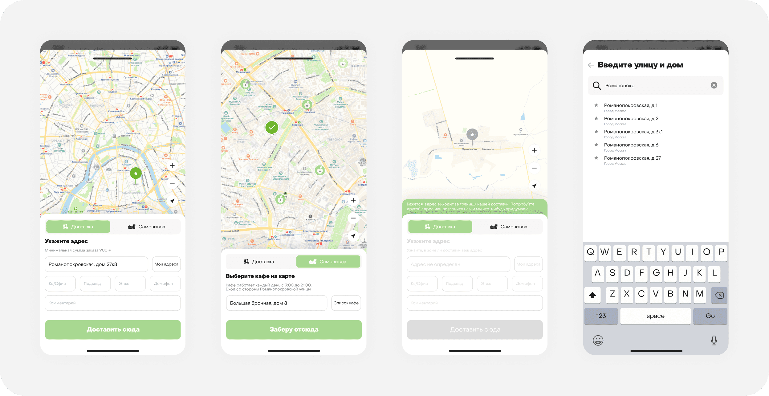 Экраны добавления адреса доставки и самовывоза предоставляют пользователю удобный интерфейс для ввода и редактирования адресов.
