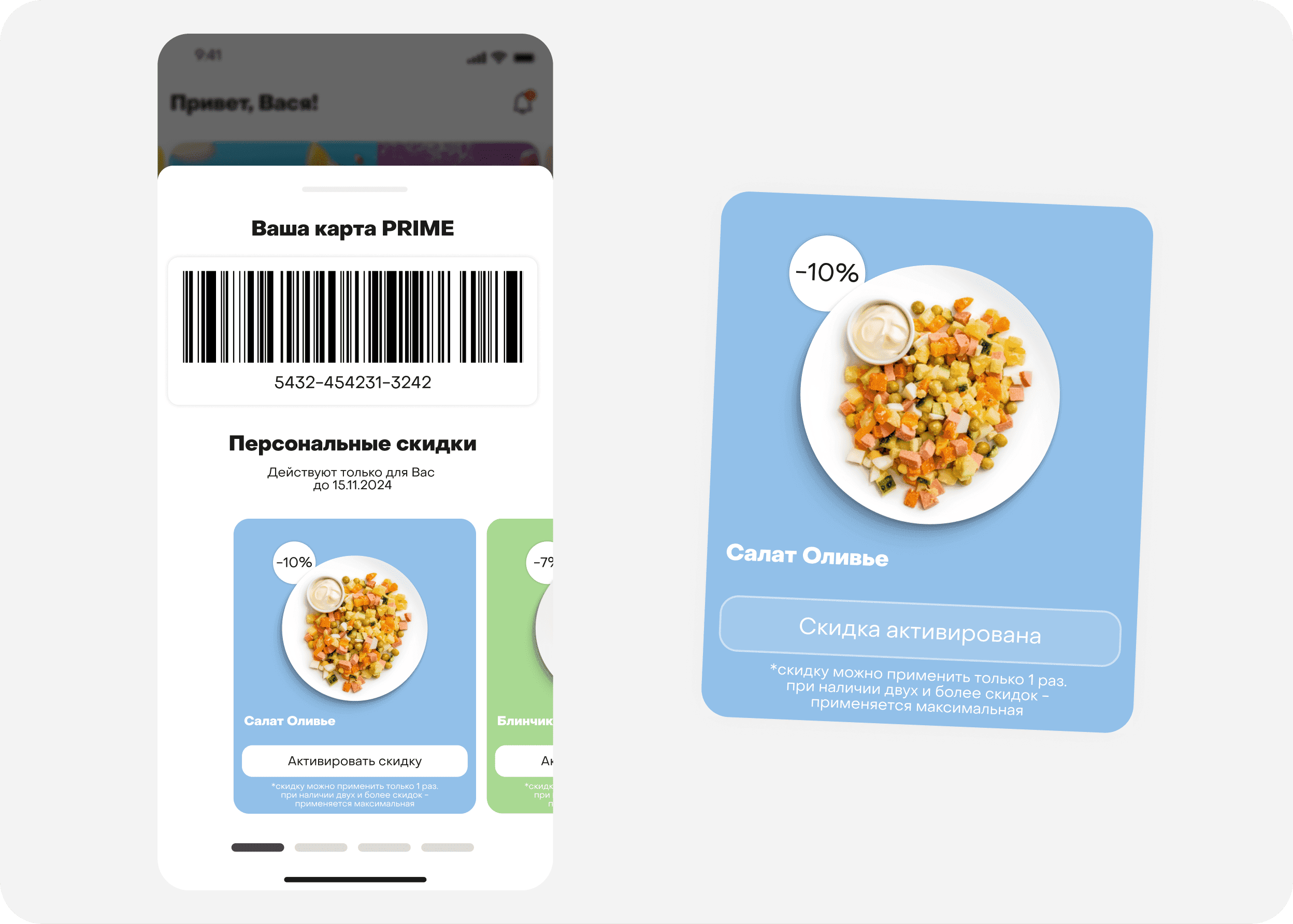 Персональные рекомендации: Рекомендации блюд на основе истории заказов и предпочтений располагаются сразу после открытия персональной карты покупателя. Раздел сделан в виде плитки популярных блюд, что стимулирует пользователя активировать скидку и выбрать дополнительный товар, увеличивая вероятность повторных и комбинированных покупок.