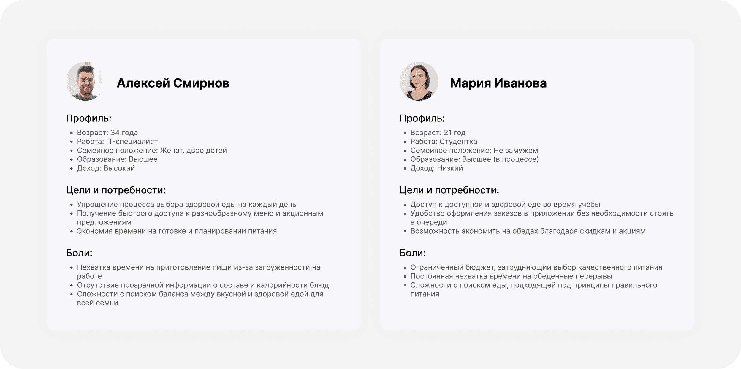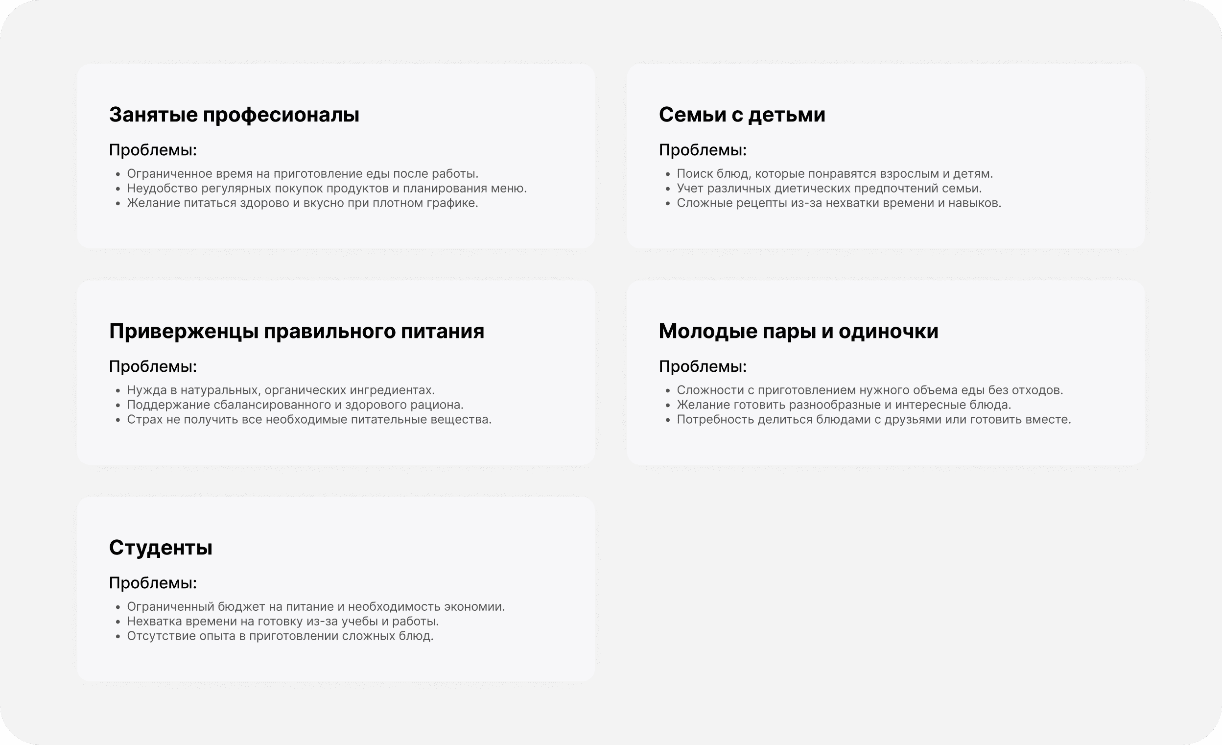 В рамках анализа целевой аудитории проекта PRIME были выделены ключевые сегменты пользователей. Каждый из них имеет уникальные потребности и сталкивается с определёнными проблемами, связанными с организацией питания. Эти данные позволили сформулировать пять основных групп, на которые направлена концепция приложения.