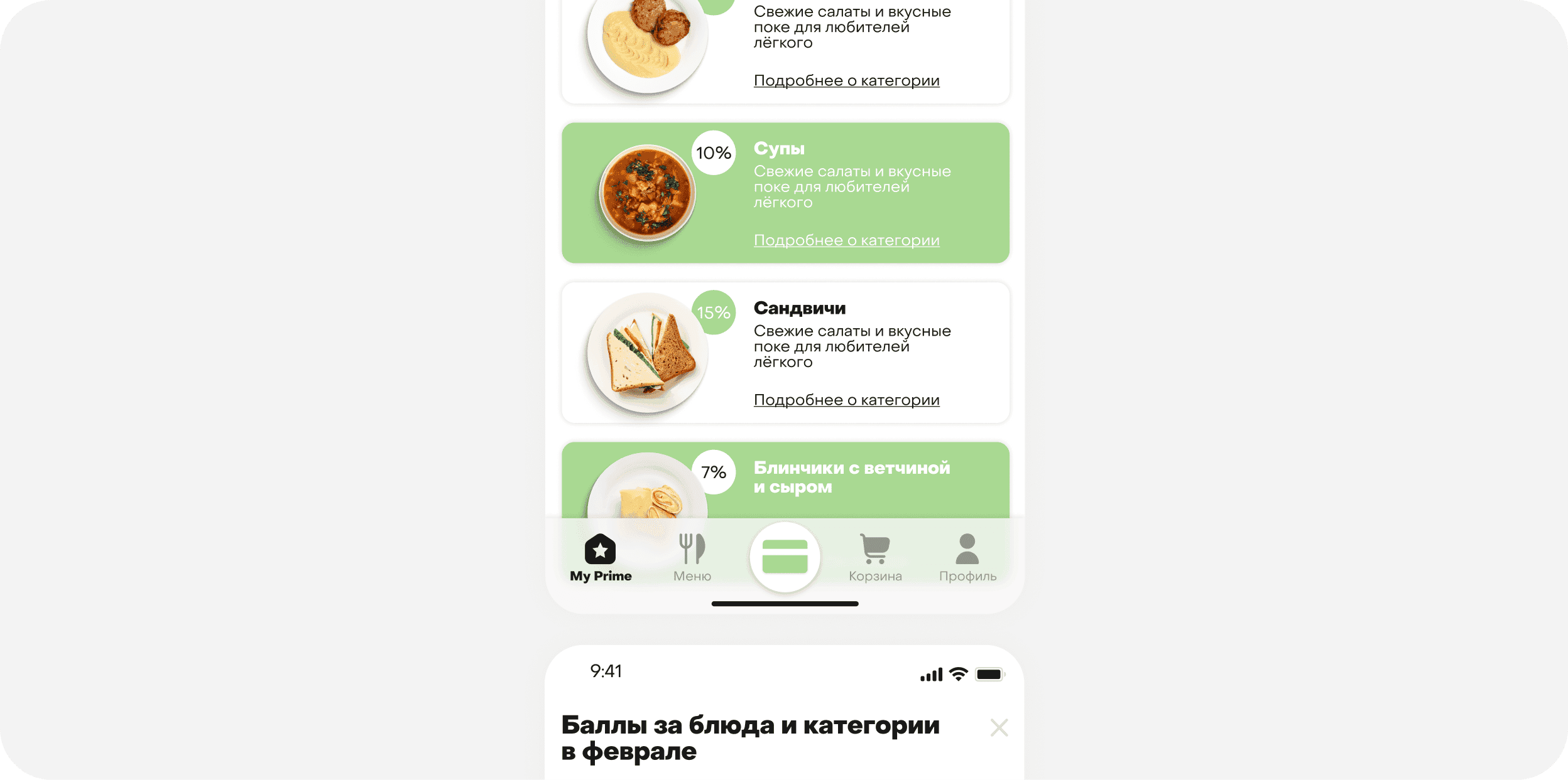 Prime Cafe — cовременная сеть ресторанов быстрого обслуживания для людей, ведущих активный образ жизни и заботящихся о своем здоровье и имидже. Решили задизайнить мобильное приложение, чтобы решить две ключевые задачи: повысить удобство для клиентов при заказах еды и внедрить инновационную программу лояльности. Это было необходимо для удержания существующих клиентов, привлечения новых и увеличения среднего чека.