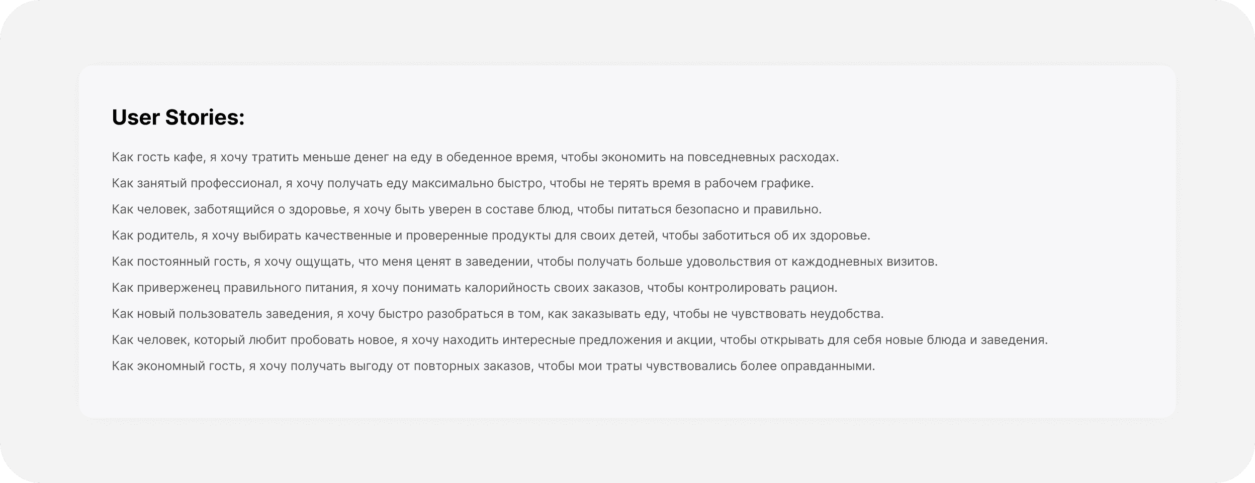 После установления основных персон, проведения глубинных интервью и определения ключевых проблем, были сформулированы User Stories.