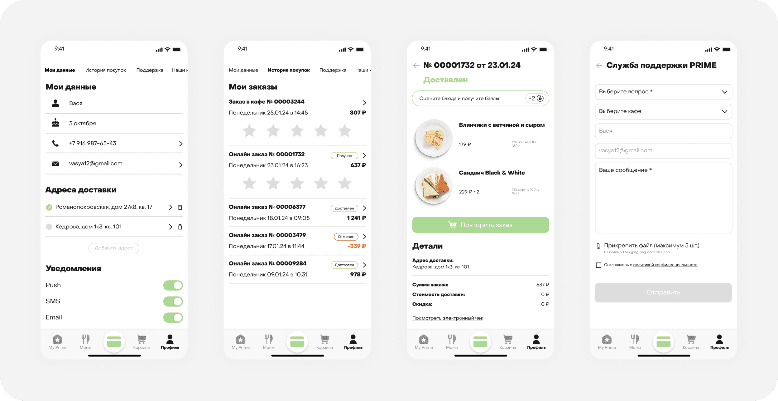 Профиль позволяет управлять личными данными, отслеживать историю заказов и баллы, а также настраивать предпочтения.